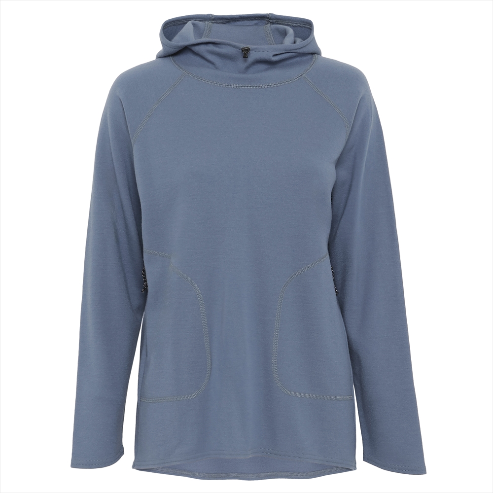 圧縮加工された上質なメリノウール素材を採用したフーディーです。通気性が高いので運動量の多いハイキングや雪山のラッセルにもオーバーヒートせず、汗を効率よく吸収して放出します。レイヤードによるごろつきをなくすためにラグランスリーブを採用し、バックパックのヒップベルトの干渉をなくすためにポケット位置を少し高く、そして裾回りはドローコードとコードロックをなくしてすっきり仕上げています。また、フードを被った時に長い髪が邪魔にならないように、フードの後ろには束ねた髪を出せるスリットを設けています。