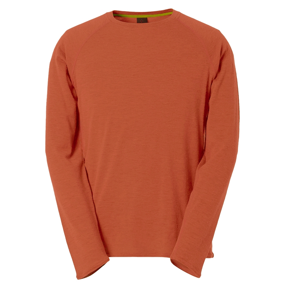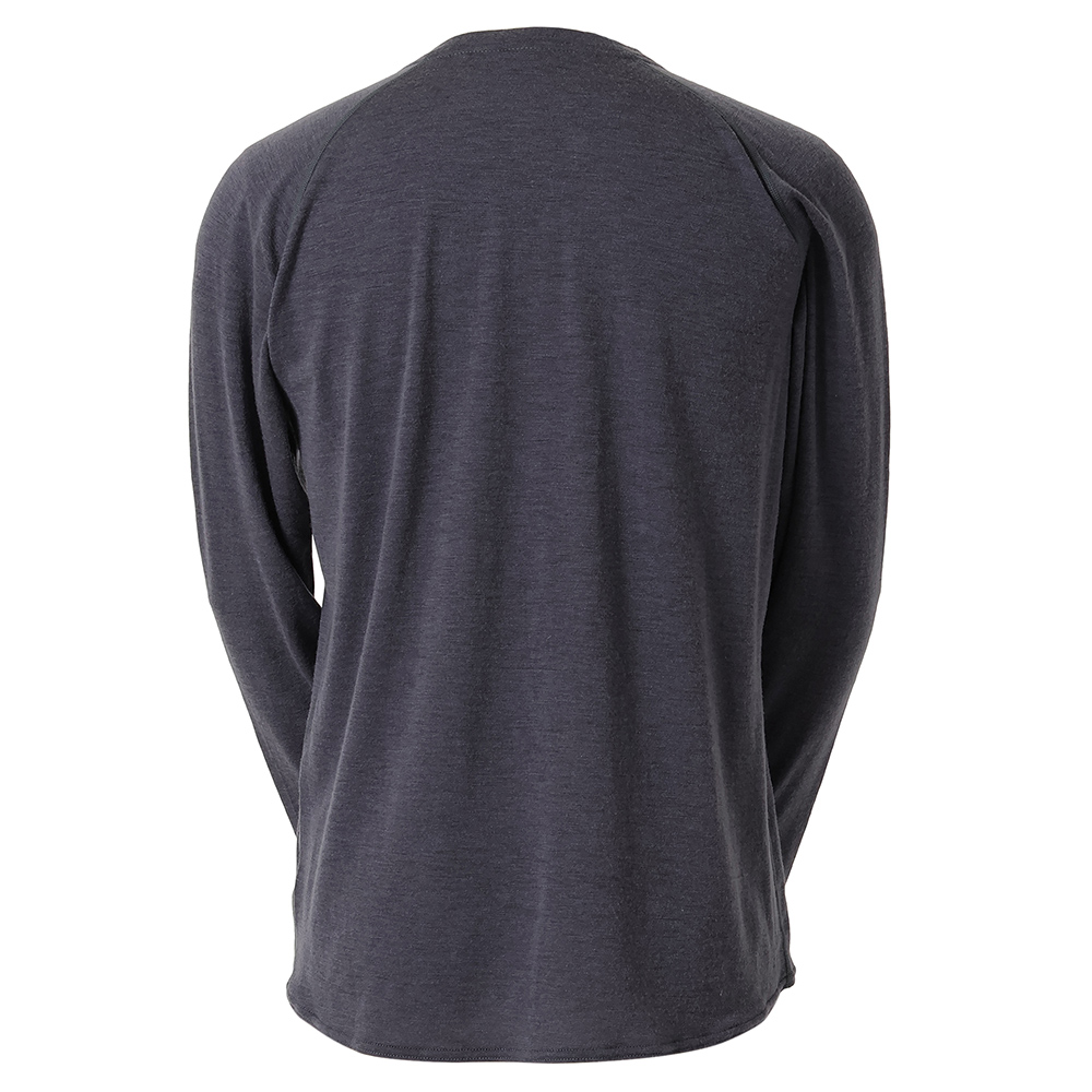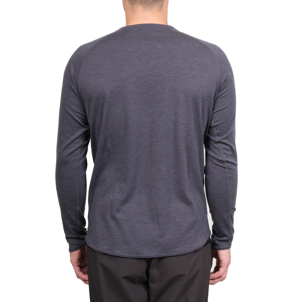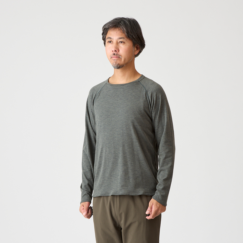 春夏向けベースレイヤー素材と同等、またはそれよりも軽いにもかかわらず、はるかにふくらみのある革新的なウール素材NUYARNを採用したロングスリーブティーシャツです。素材の良さを引き出すために敢えてシンプルなデザインを採用し、レイヤード時の肩まわりのごろつきをなくすためにラグランスリーブで仕上げています。運動量の多いハイキングや雪山のラッセルにもオーバーヒートしないちょうどいい保温性と通気性、そして吸汗調湿性があります。