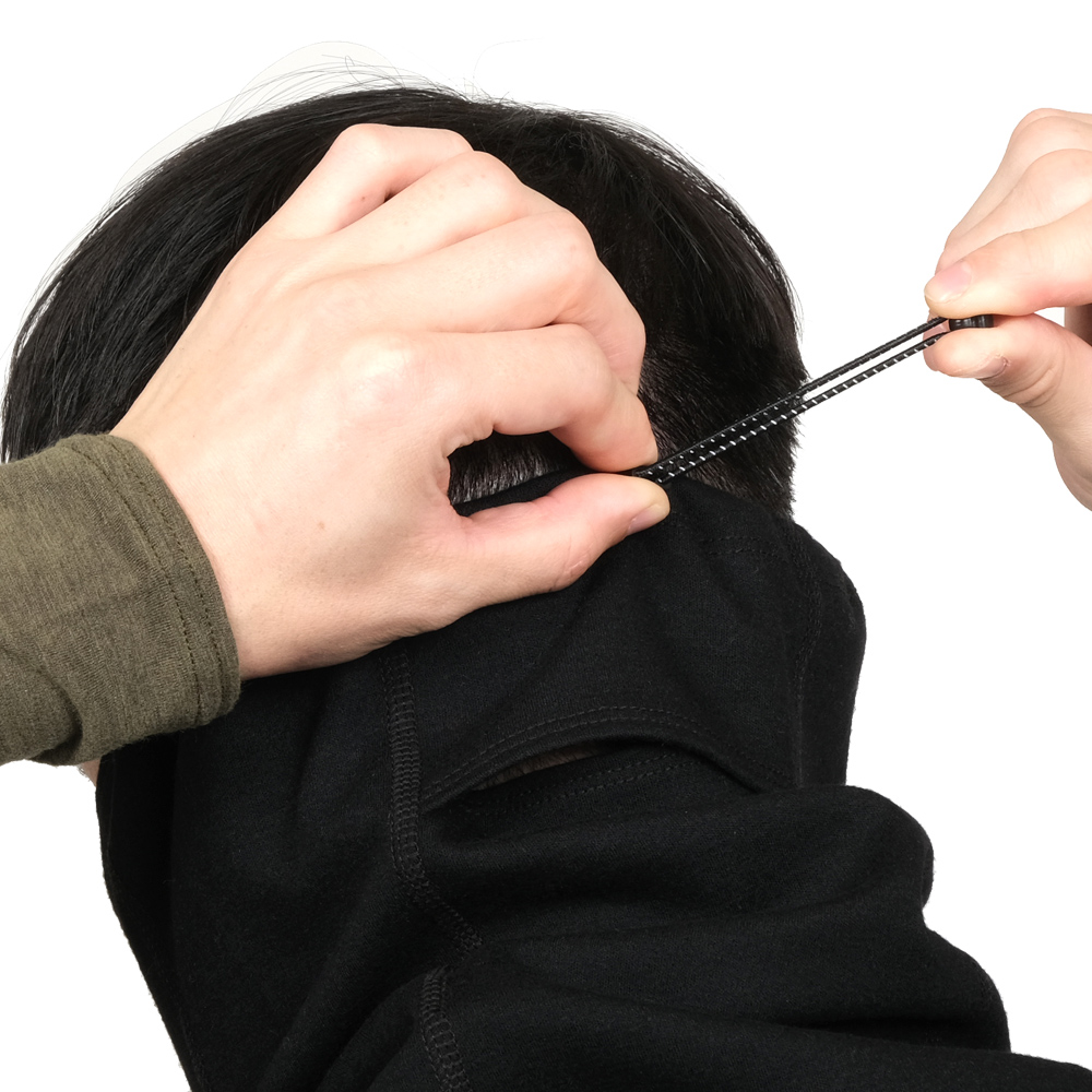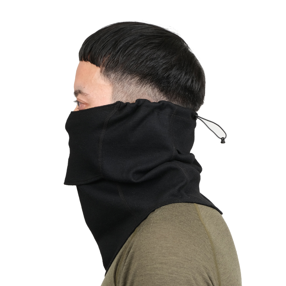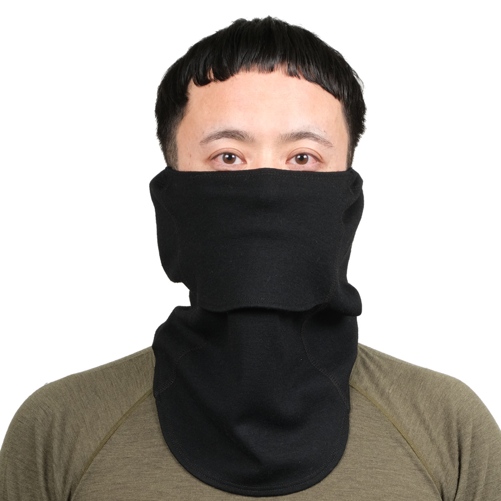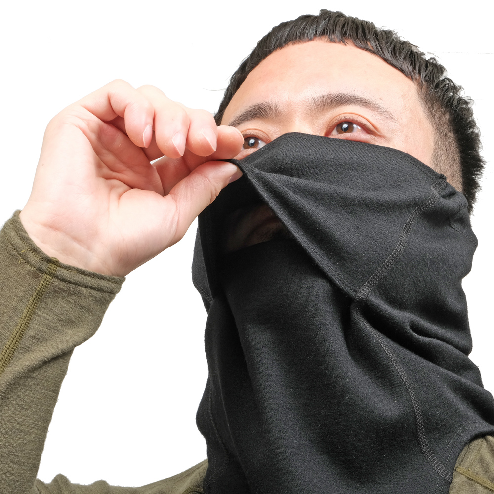 圧縮加工された上質なメリノウール素材を採用したフェイス&ネックウォーマーです。目元から首まわり、そして寒さに弱い耳もしっかりガードします。口まわりは生地を二枚重ねて開くようにしてあるので、着用したままの状態で水分や行動食を補給でき、裾の裁断は肩のラインに馴染むようにしてあるので余計な隙間やごろつきがありません。必要十分な保温性がありながら高い通気性によって運動量の多い雪山登山や深雪のラッセルにもオーバーヒートせず、汗を効率よく吸収して放出します。