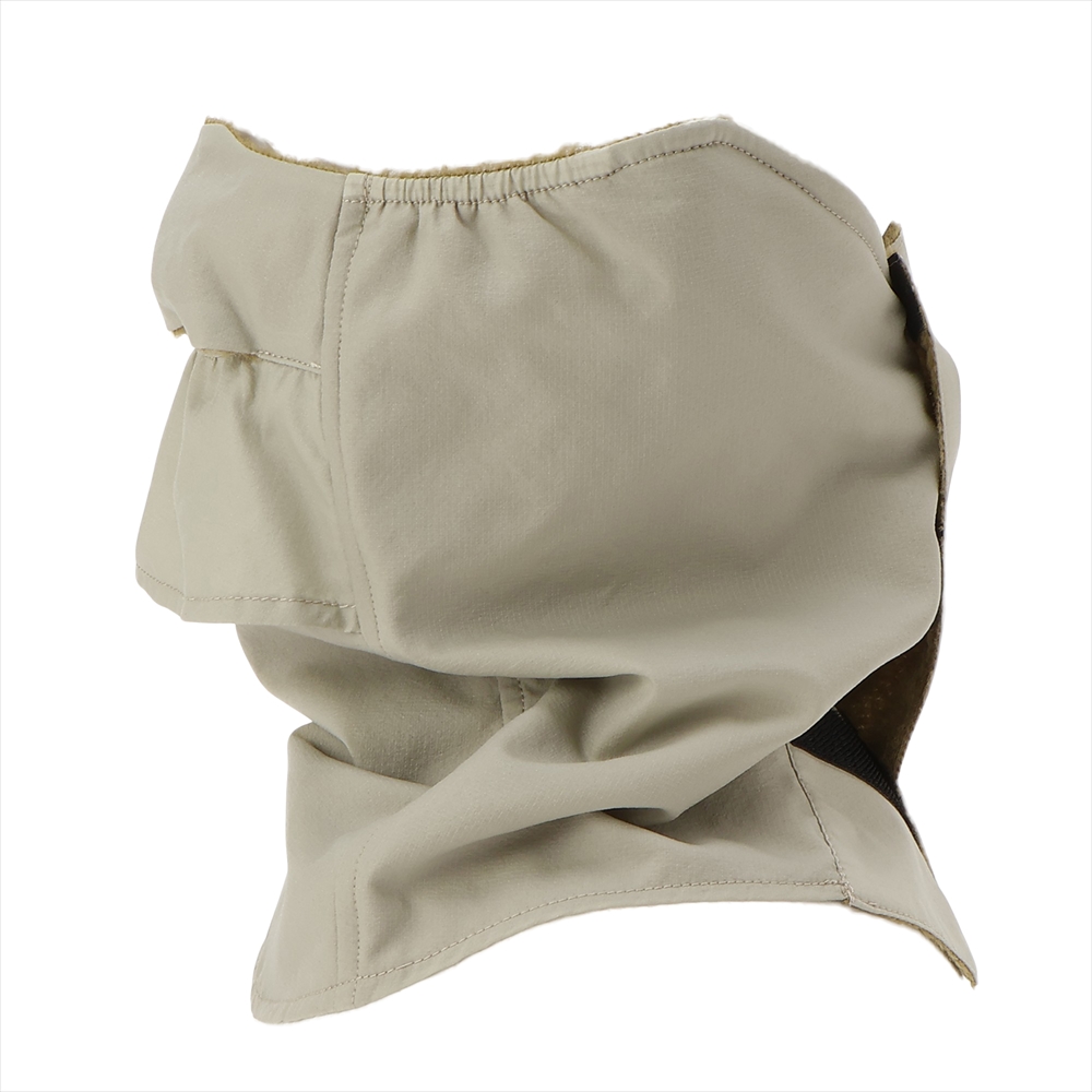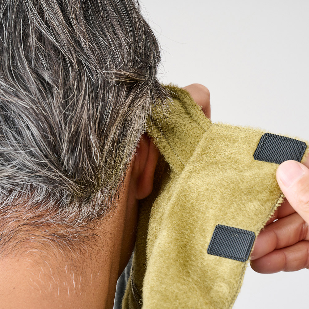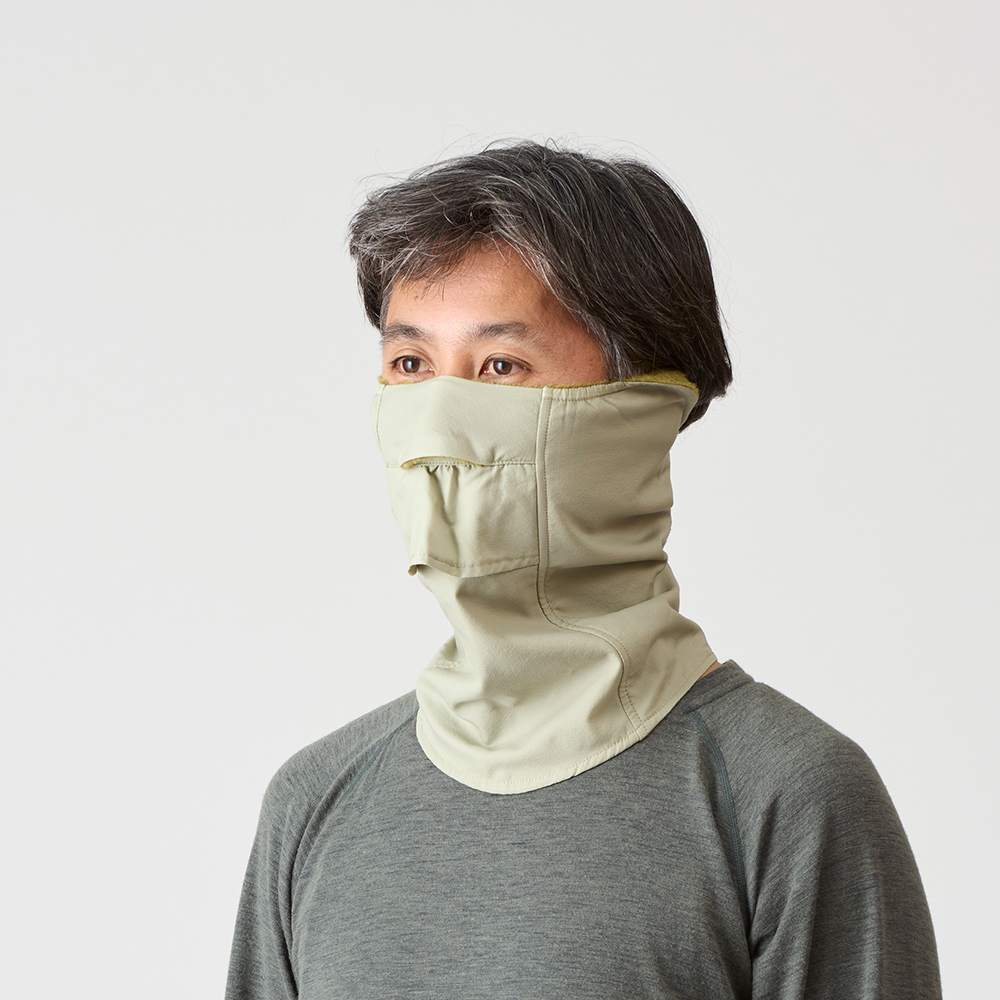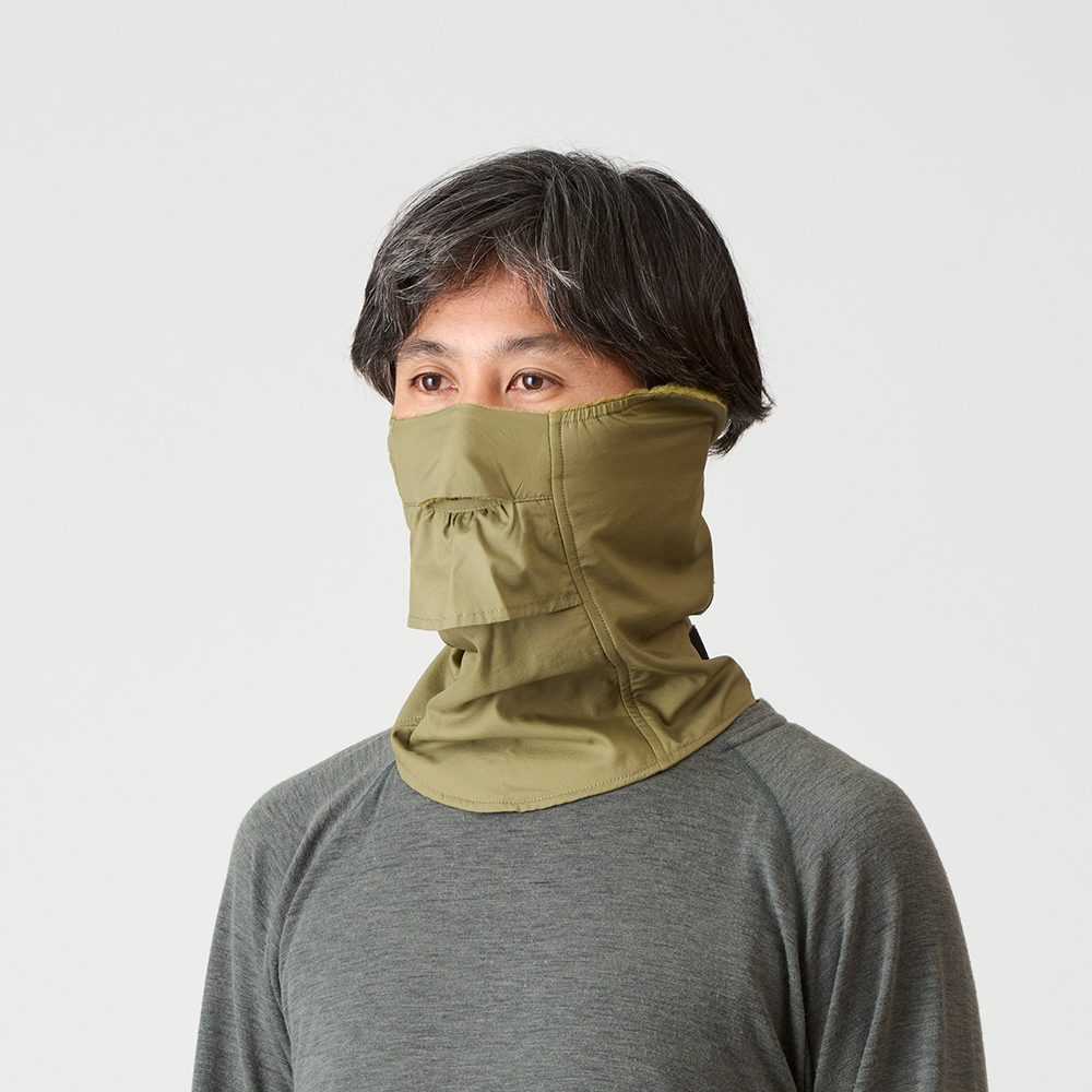 冬から春先までの長いシーズンで使用できます。ネックゲイターのように筒状ではなく後部が開く仕様なので、ニットビーニー等を被ったまま着脱できます。面ファスナーの重ね巾によってフィットを調節でき、面ファスナーの間から束ねた髪を出せるのも便利です。耳の上部は耳ポケットを被せてしっかり保温しましょう。