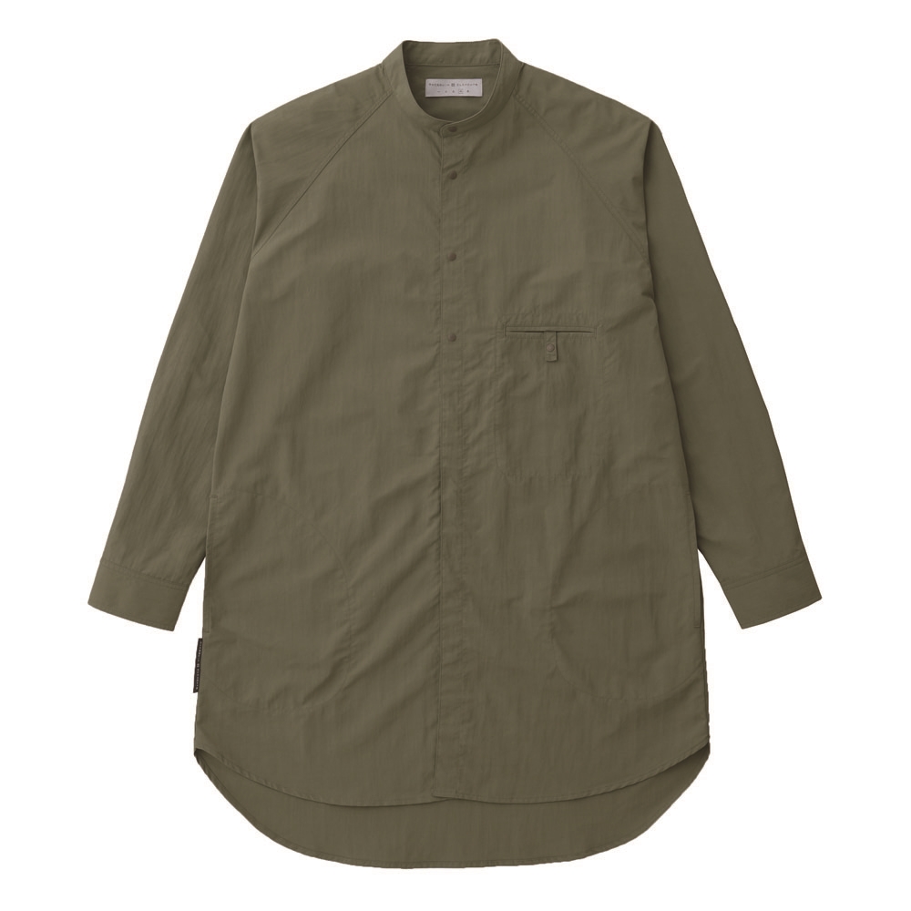 野鳥のさえずりや沢の流れが聞こえるクラシックルートをのんびり歩くときにちょうどいい、膝上までのロング丈が特長のリラックスシャツです。意外と防風性の高いこのシャツは、風の強い日には膝上までをカバーするウィンドブレーカー代りに、また、春の少し肌寒い日にはジャケット代わりにも使えます。やや薄手のタスラン生地を採用したこのシャツはふんわりと軽やかで、天然素材のようなやわらかい風合いとナチュラルな表情を楽しむことができます。また、耐久性に優れていてシワにもなりにくいので山の温泉宿に泊りながらの古道巡りにも重宝します。