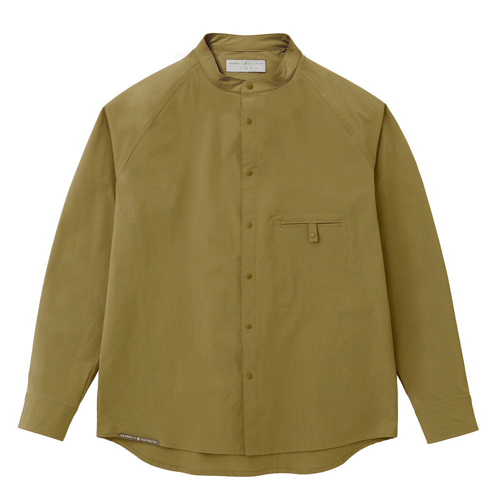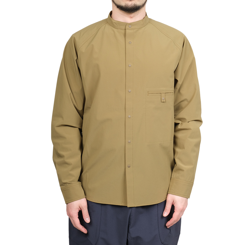 - バンドカラーで衿周りをすっきりさせた、薄すぎず厚すぎない、秋冬シーズンにちょうどいい厚みのソフトシェルのシャツ。