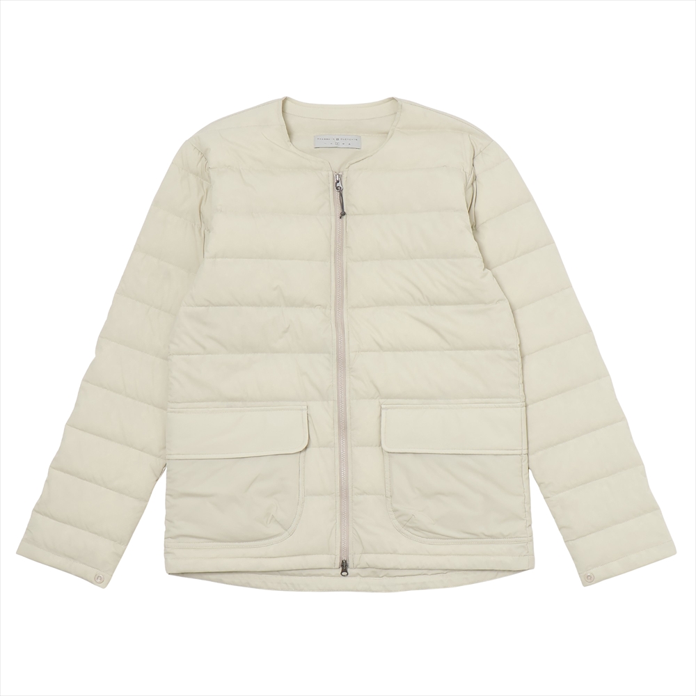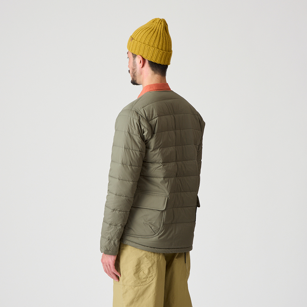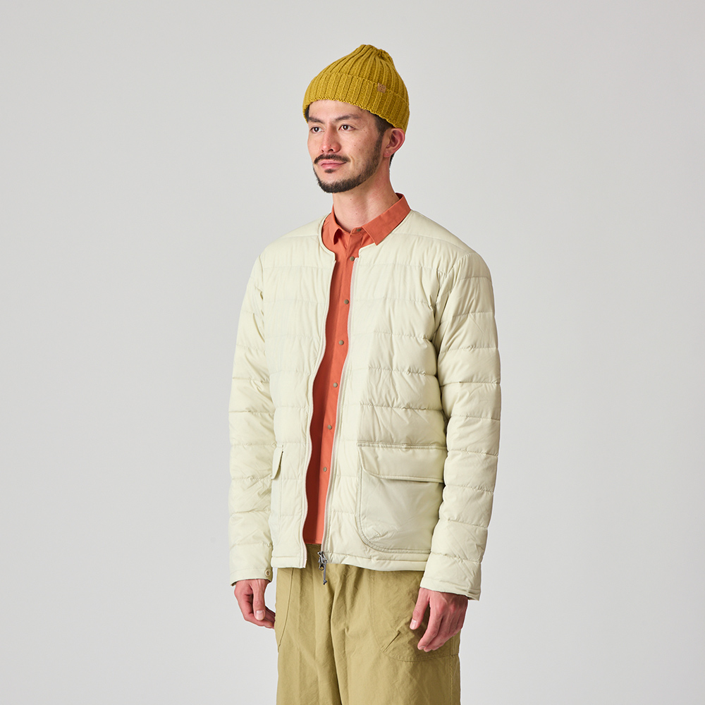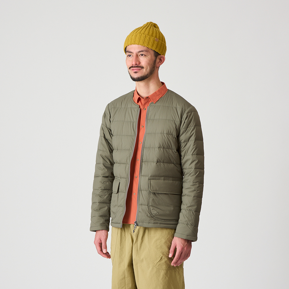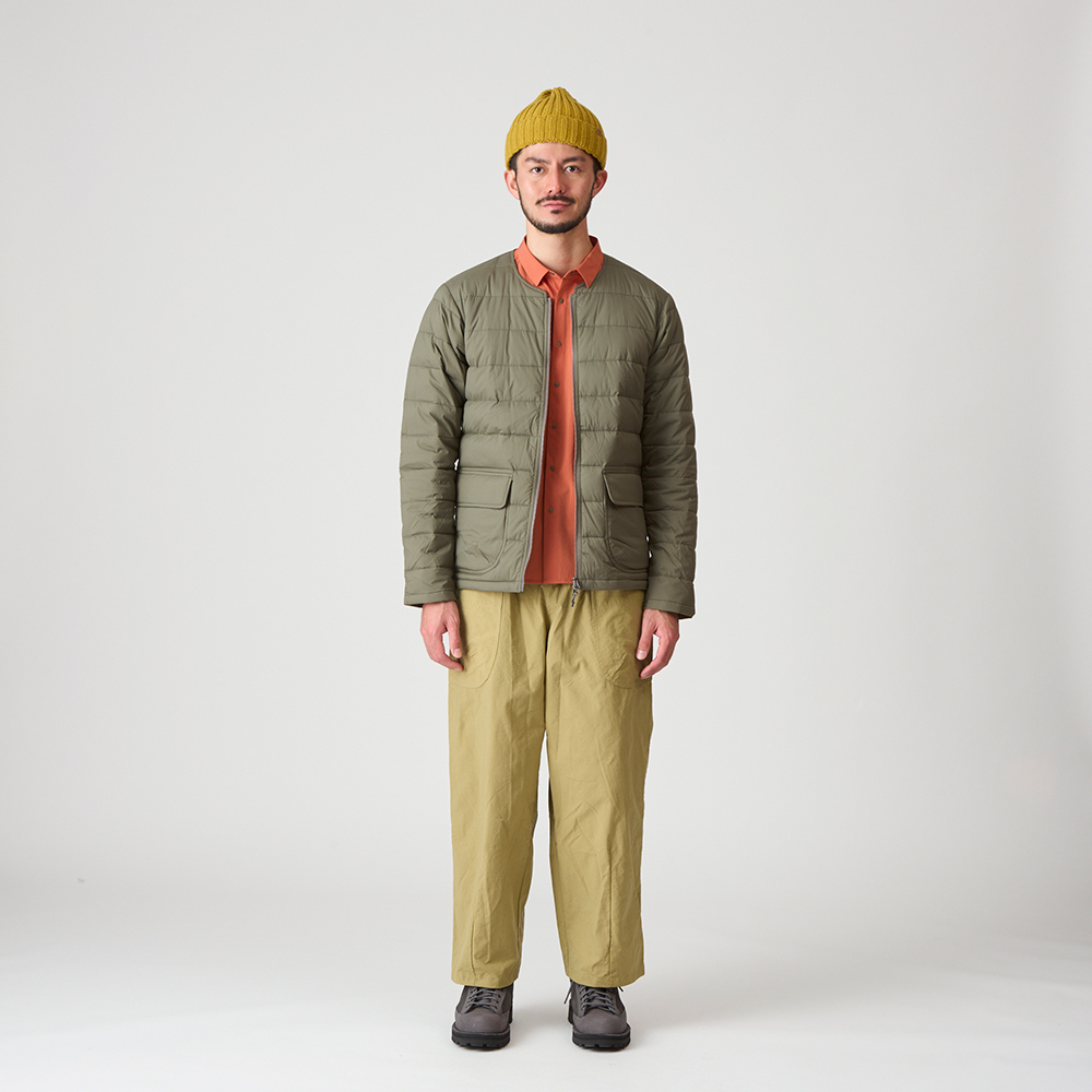 アウターとしてもインナーとしても活躍する、冬のクラシックルート歩きにちょうどいい薄手のダウンジャケットです。ポケットはAXESQUIN ELEMENTSのパンツでおなじみのデザインをベースに、使い勝手を考えて前側を広くしてフラップを付けています。やや細身でシンプルなデザインはコーディネートの邪魔をせず、下山後の移動時には普段着のように自然に着ることができます。