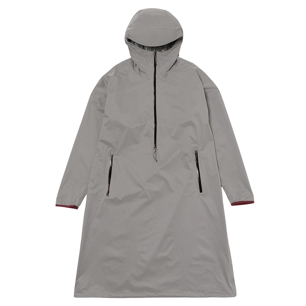 雨の日のクラシックルート歩きにピッタリな、プルオーバー仕様のロングコートです。着丈が長く頭から膝まで覆うので、これ一枚でも容易には雨に濡れない安心感があります。防水透湿素材を使用していますが、峠までの登りでは汗の放出が追い付かずに蒸れを感じるかもしれません。そんなときにはフロントファスナーを下から開ければベンチレーションとして機能する他、フード周りを開くことなくインナーのシャツやポーチになどにアクセスできます。また、長いフロントファスナーはパンツのように穿いたり脱いだりできるので便利です。腰の左右に配置されたジッパー(スルーポケット)はパンツのポケットにアクセスできるだけでなくベンチレーションとしても機能し、バックパックのヒップベルトを内側に通して止めることができるのでベンチレーションを妨げることもありません。
