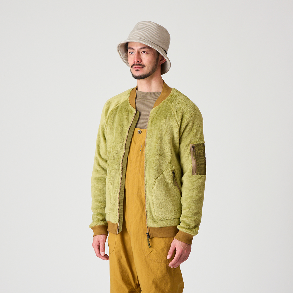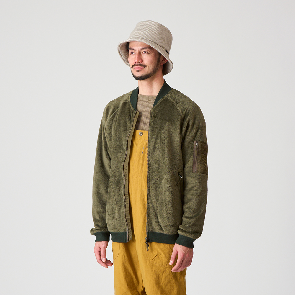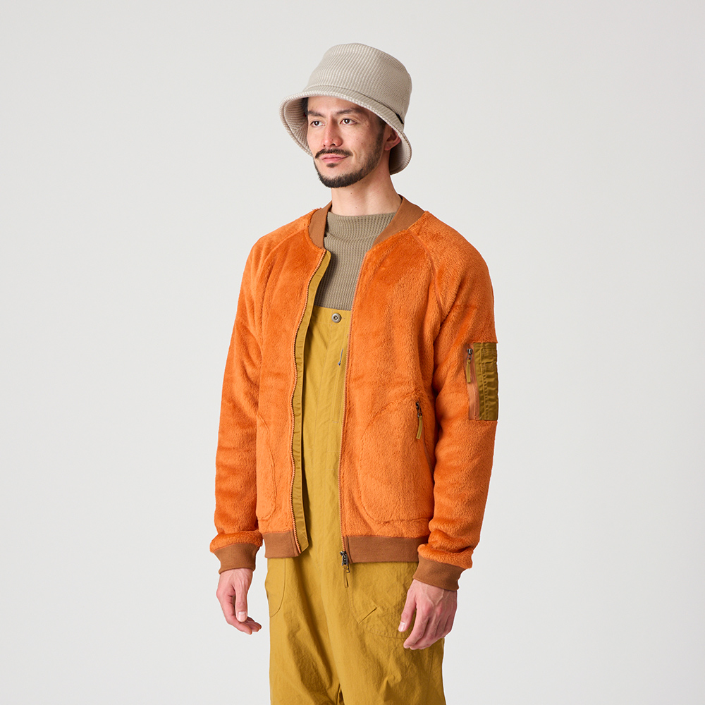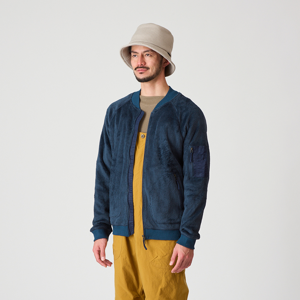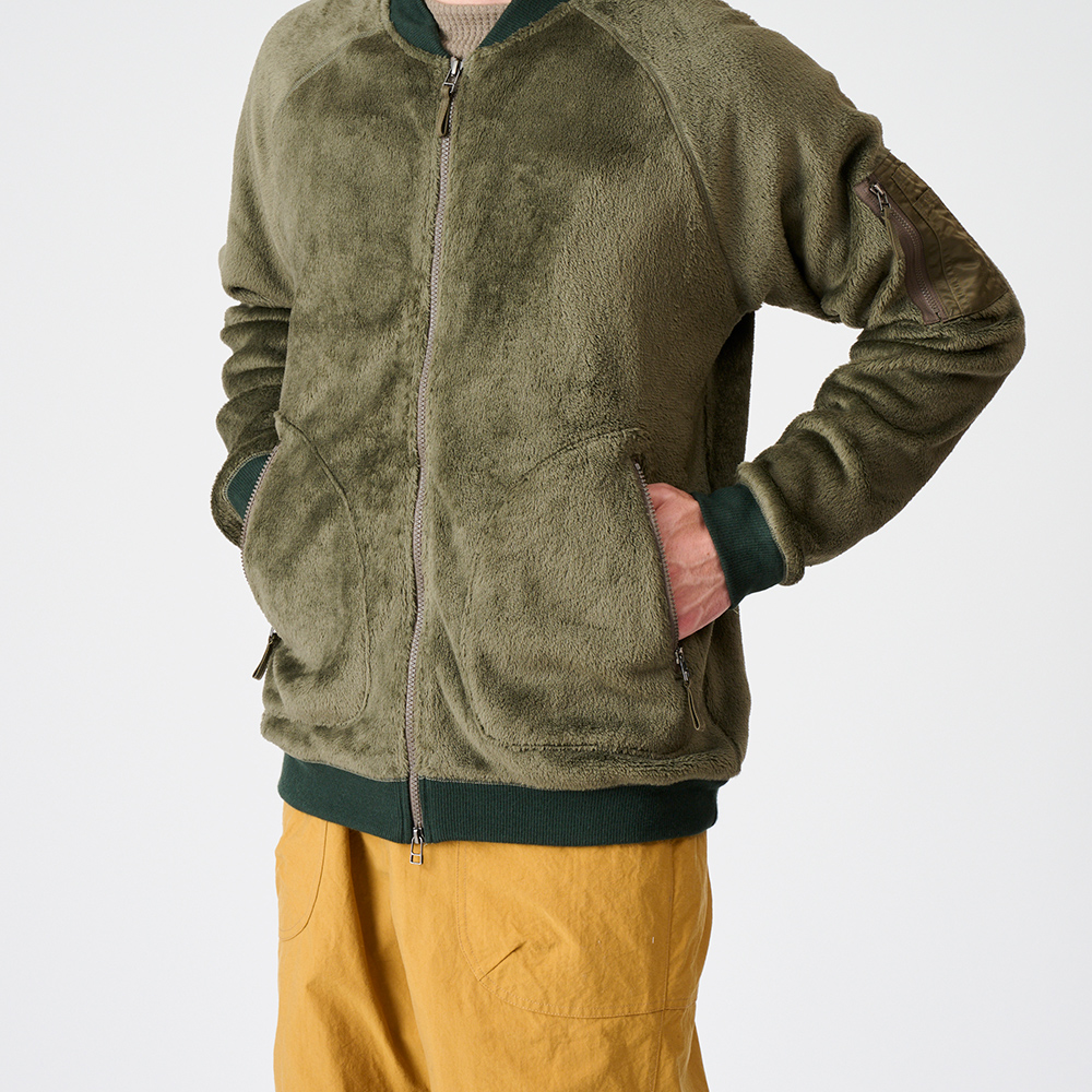 紅葉を愛でながらひと気のない古道をのんびり歩くのに最適な、ふわふわな風合いが気持ちいいハイロフトフリースのジャケットです。フライトジャケットをヒントにしたデザインとハイロフトフリースのバランスが絶妙で、リブ使いの衿、袖口、裾と肩まわりをすっきりさせたラグランスリーブがリラックスした着心地を提供し、アクセスしやすいハンドポケットは手の保温に便利です。通気性の高い素材なので着っぱなしでもオーバーヒートしにくく、汗を積極的に放出してくれるので快適な状態が長続きします。