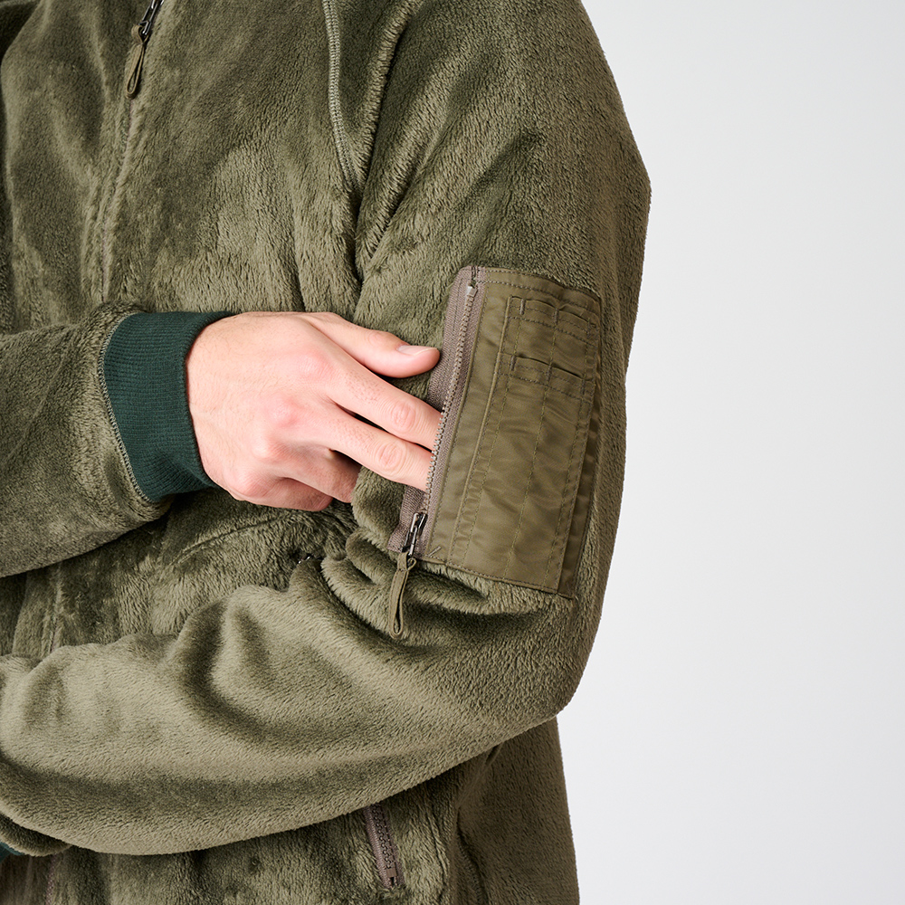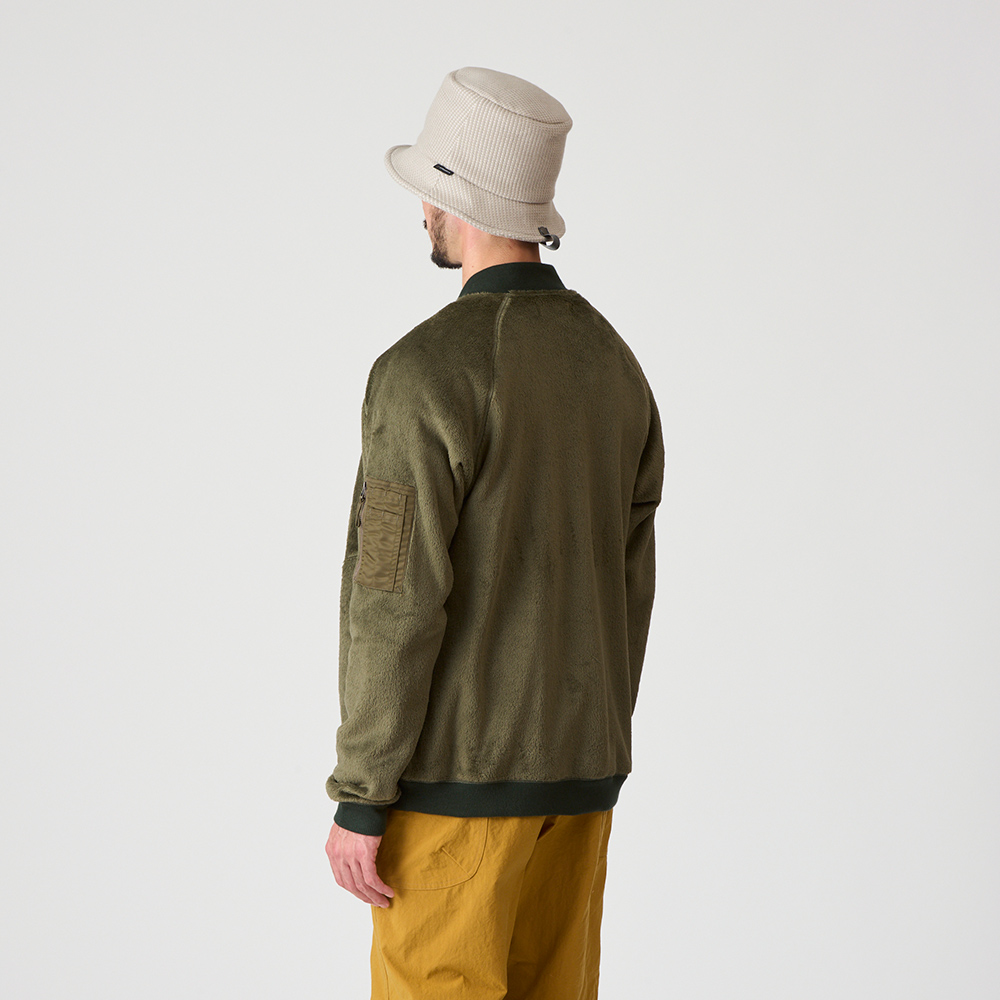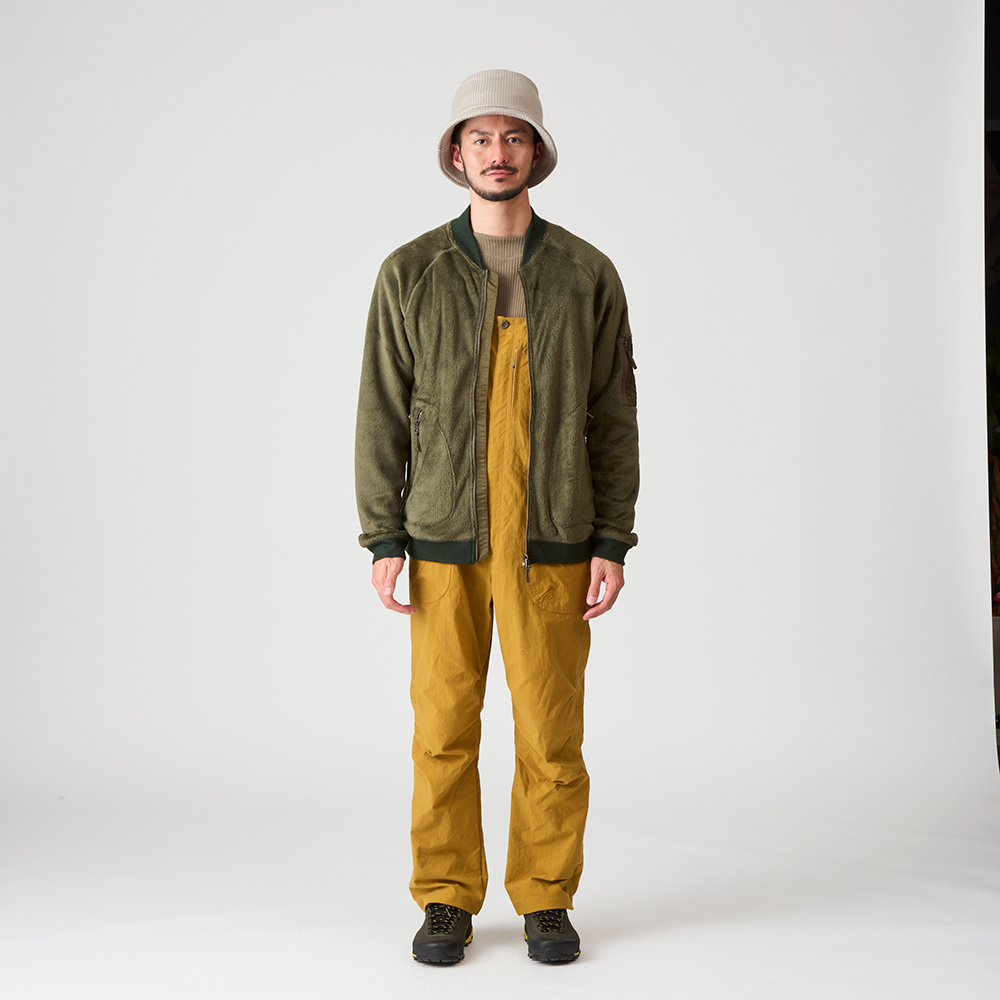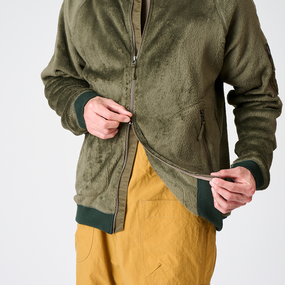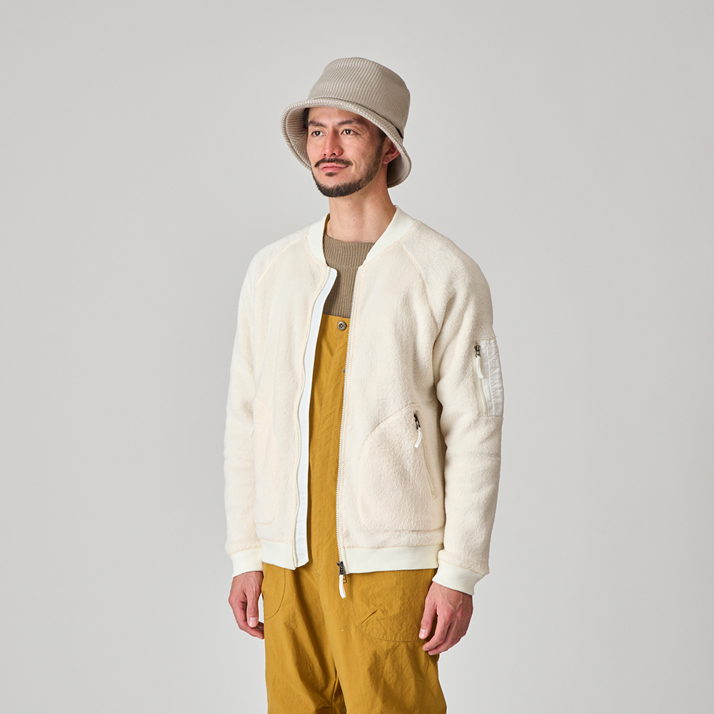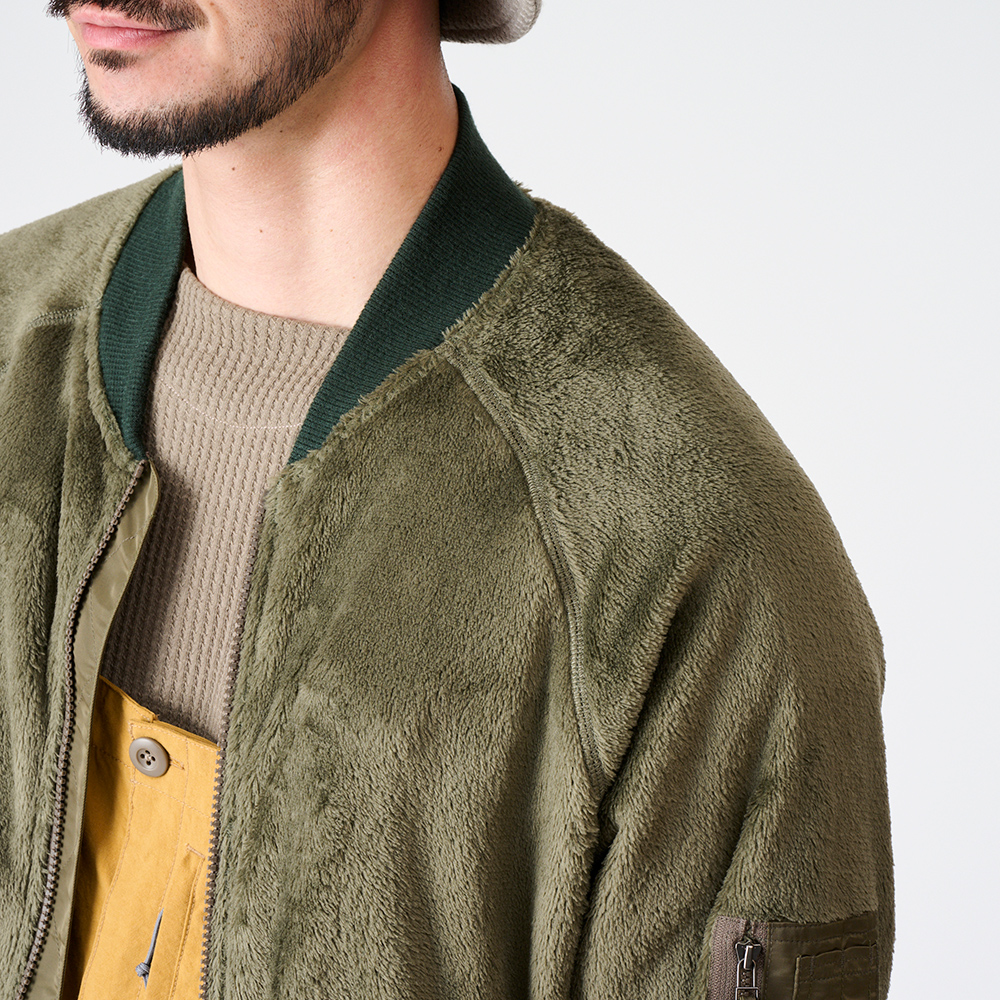 紅葉を愛でながらひと気のない古道をのんびり歩くのに最適な、ふわふわな風合いが気持ちいいハイロフトフリースのジャケットです。フライトジャケットをヒントにしたデザインとハイロフトフリースのバランスが絶妙で、リブ使いの衿、袖口、裾と肩まわりをすっきりさせたラグランスリーブがリラックスした着心地を提供し、アクセスしやすいハンドポケットは手の保温に便利です。通気性の高い素材なので着っぱなしでもオーバーヒートしにくく、汗を積極的に放出してくれるので快適な状態が長続きします。