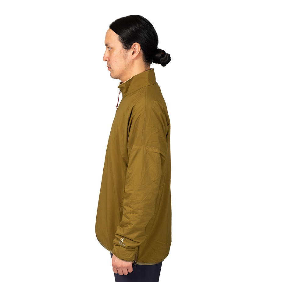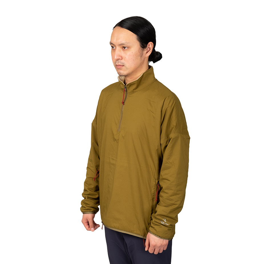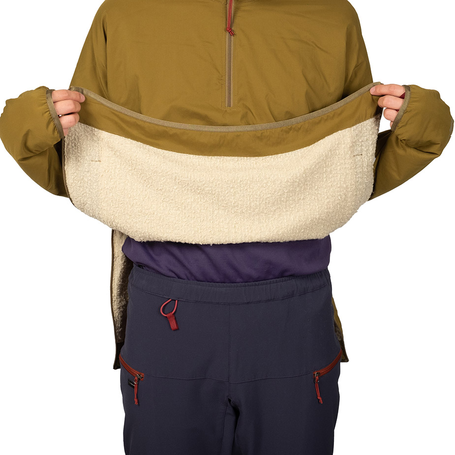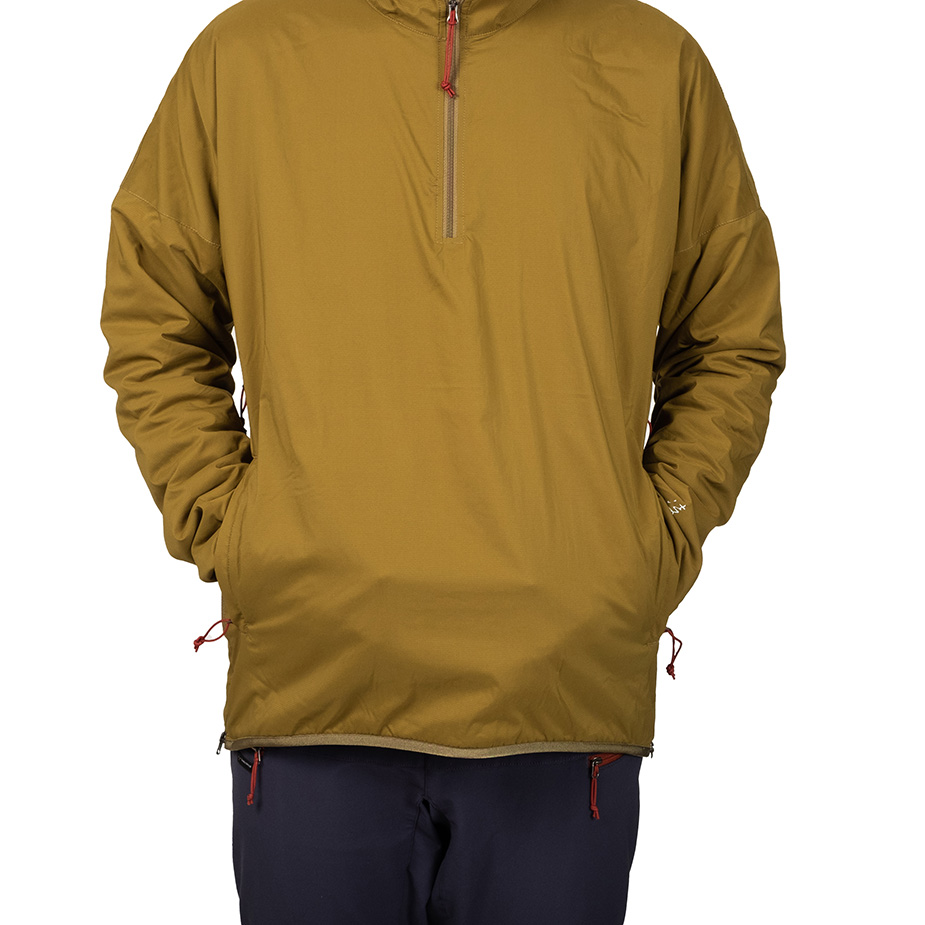 適度な防風性を備えながら通気性と蒸れにくさを備え、ストレッチ性に優れるシェルと汗を吸収して放出するメリノウール混のライニングをコンバインした、孤高のシノラーのためのストイックなプルオーバーセーター。冬にはアクティブレイヤーとして、春と秋にはアプローチに、夏は休憩時の汗冷え防止に、一年を通してシノギングに使用できます。ウィンドシェルよりも通気性がありフリースよりも防風性がありオーバーヒートしない、ほどほどの保温性を備えているので、膝であごを蹴り上げそうな急斜面の直登から緩やかな陽だまりの尾根まで、変化に富む低山のバリエーションルートもこれ一枚で快適に凌げます。デザインがシンプル過ぎて目に止まりにくいのですが、このスペックを見ればどれだけの機能を備えているかわかるはずです。