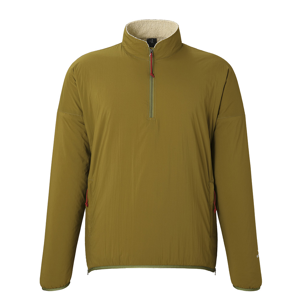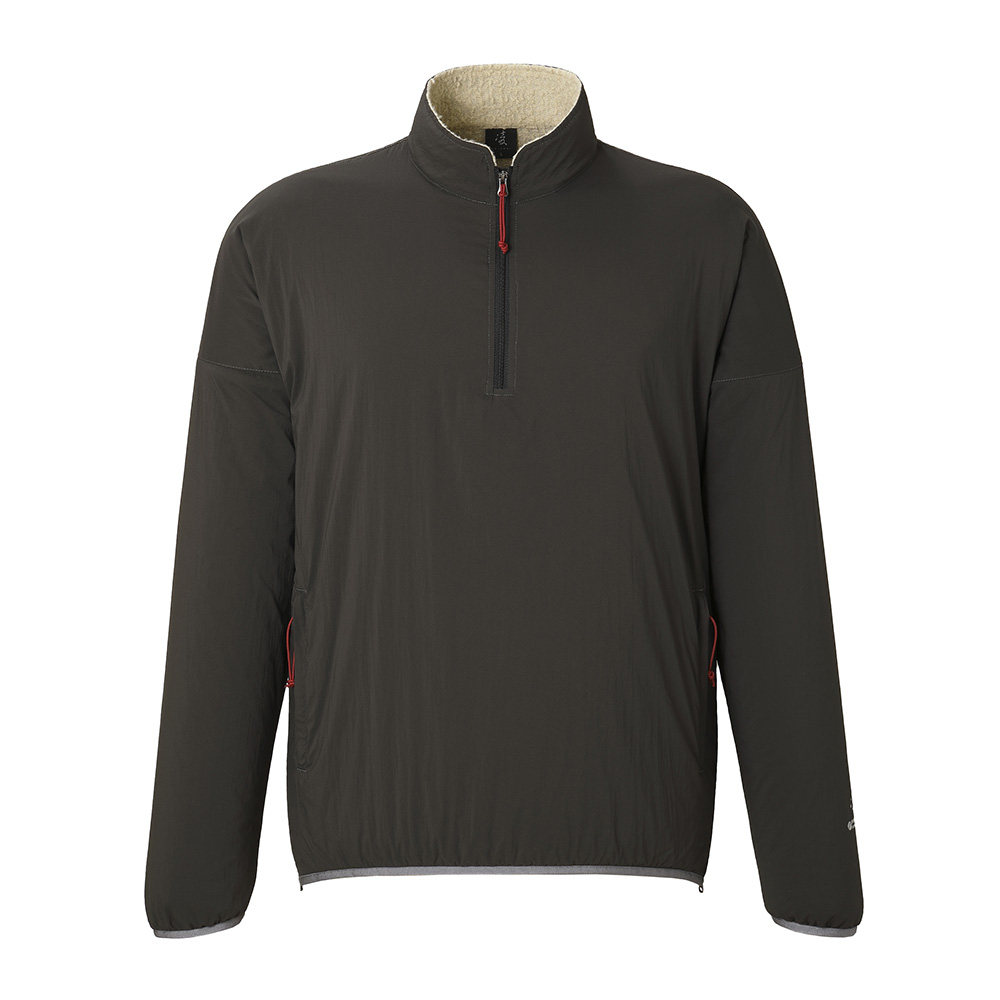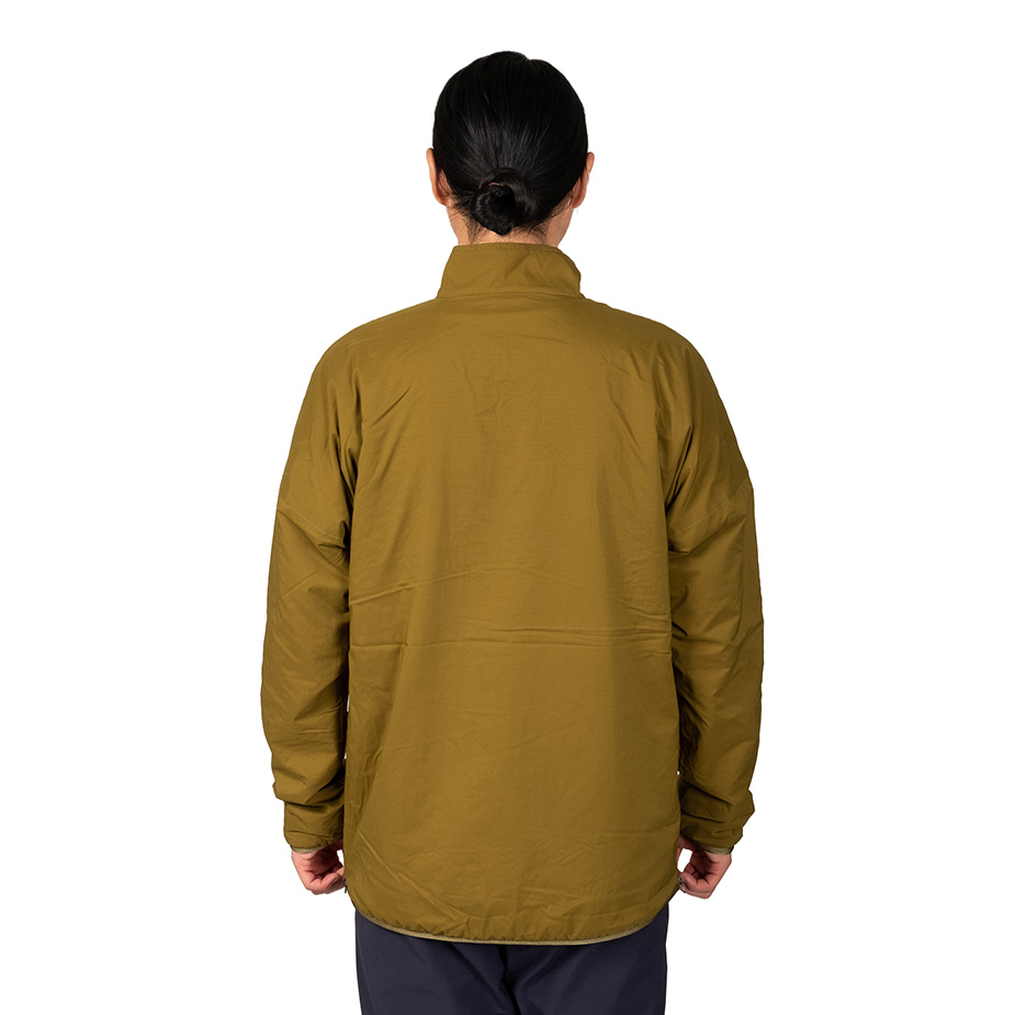 適度な防風性を備えながら通気性と蒸れにくさを備え、ストレッチ性に優れるシェルと汗を吸収して放出するメリノウール混のライニングをコンバインした、孤高のシノラーのためのストイックなプルオーバーセーター。冬にはアクティブレイヤーとして、春と秋にはアプローチに、夏は休憩時の汗冷え防止に、一年を通してシノギングに使用できます。ウィンドシェルよりも通気性がありフリースよりも防風性がありオーバーヒートしない、ほどほどの保温性を備えているので、膝であごを蹴り上げそうな急斜面の直登から緩やかな陽だまりの尾根まで、変化に富む低山のバリエーションルートもこれ一枚で快適に凌げます。デザインがシンプル過ぎて目に止まりにくいのですが、このスペックを見ればどれだけの機能を備えているかわかるはずです。