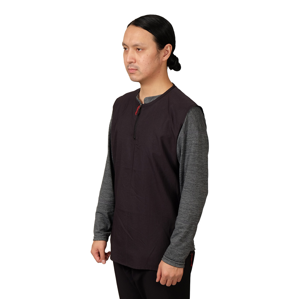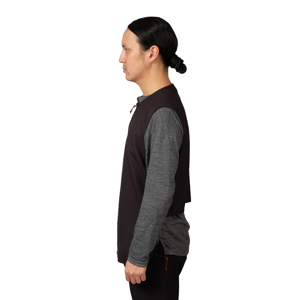 シルベは主役を引き立てる脇役中の脇役。シノギング用のミニマルなベストです。一般的にハイキング用のベストには便利そうなポケットがたくさんついていますが、衣服のポケットにあれこれ入れたままでシノギングをしてほしくないので、いさぎよくポケットなしのデザインにしています。必要な物はヤマバッグに入れましょう。