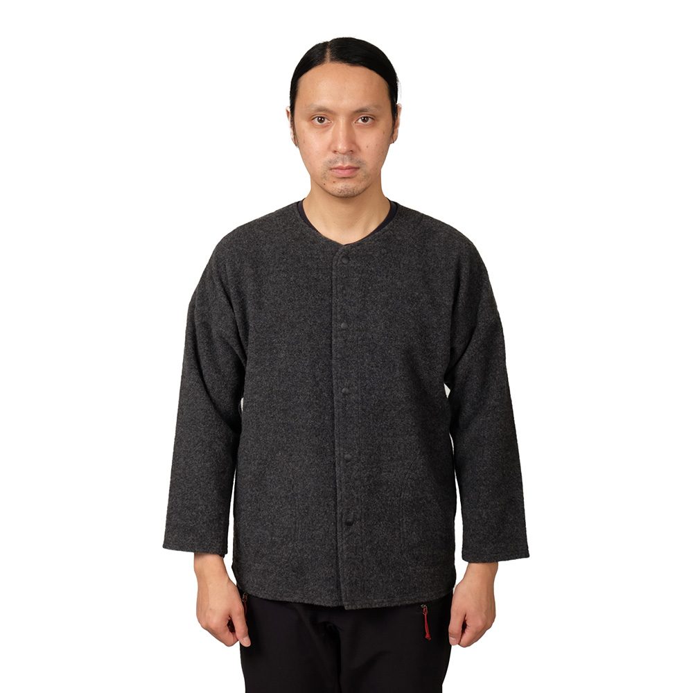 起毛されたウール素材は見た目よりも軽い着心地で、ハイロフトフリースのような厚みがないにもかかわらず、ウールならではの暖かさを感じることができます。シノギングでたっぷり掻いた汗が、表面に細かな水滴となっているのがわかるほど汗を放出してくれます。また、ウールには天然の抗菌防臭効果があるので、マタギの狩りのように数日に渡るシノギングにも安心して使えます。