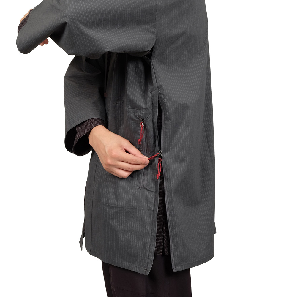 ヒネモスの上にちょいと羽織ってタッツケを穿けば凌ネオ・クラシックスタイルの完成です。ウロコシャツの上に羽織るのも粋でしょう。ヒップベルトの付いたバックパックを背負うときにはサイドジッパーを開けて、ヒップベルトを裾の内側に通してください。こうすることで本来のシルエットを崩さずに着こなすことができます。鎌の代りに凌ピッケルを携えて、さあシノギング!