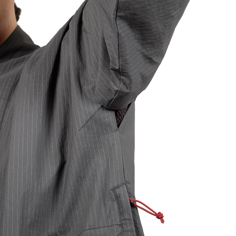 スーツの生地のような細いストライプが印象的なこの素材は、こう見えて撥水加工を施したソフトシェルなのです。やや薄手でドライな風合いは肌あたりが良く、適度な通気性と防風性を備えています。