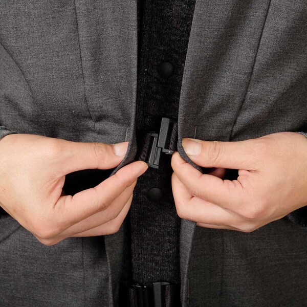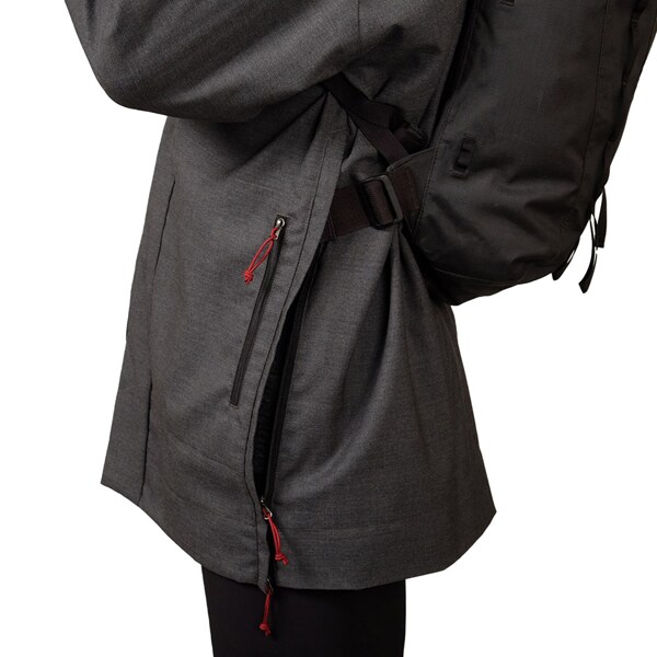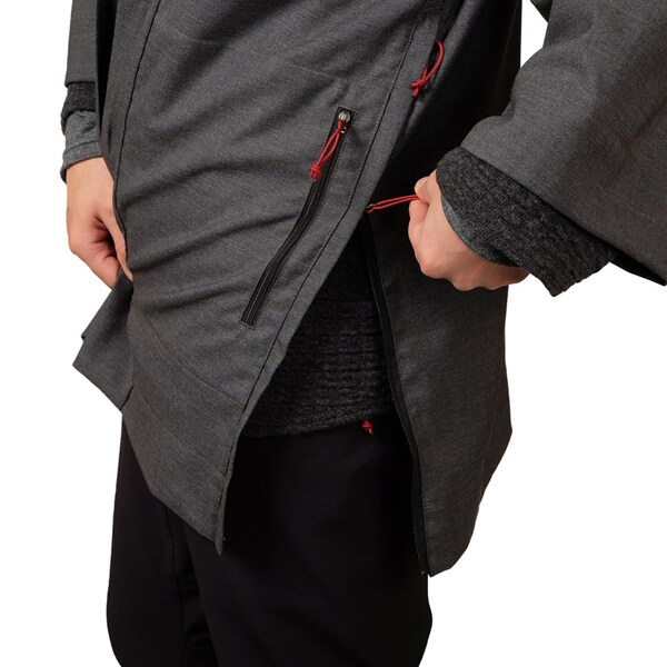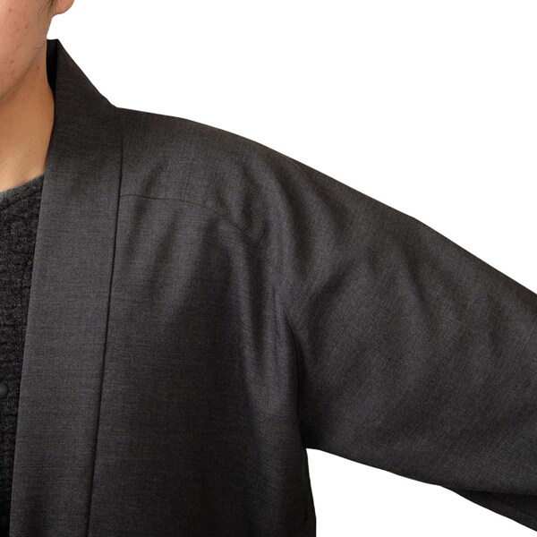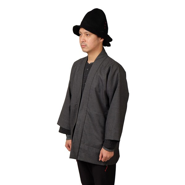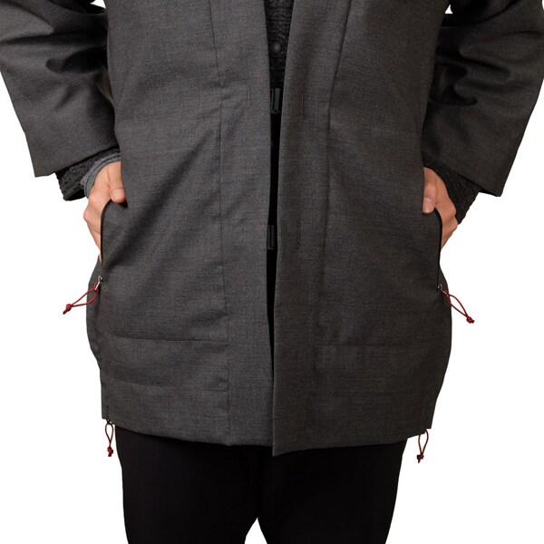 半纏はやはり前をはだけて着るのが粋ですが、それでは風が気になることもあるでしょうから、そんな時にはシルベをインナーにレイヤードして下さい。こうすることで風を和らげることができ、見た目にもグッと凌らしくなります。ヒップベルトの付いたバックパックを背負うときにはサイドジッパーを開けて、ヒップベルトを裾の内側に通して下さい。こうすることで本来のシルエットを崩さずに着こなすことができます。
