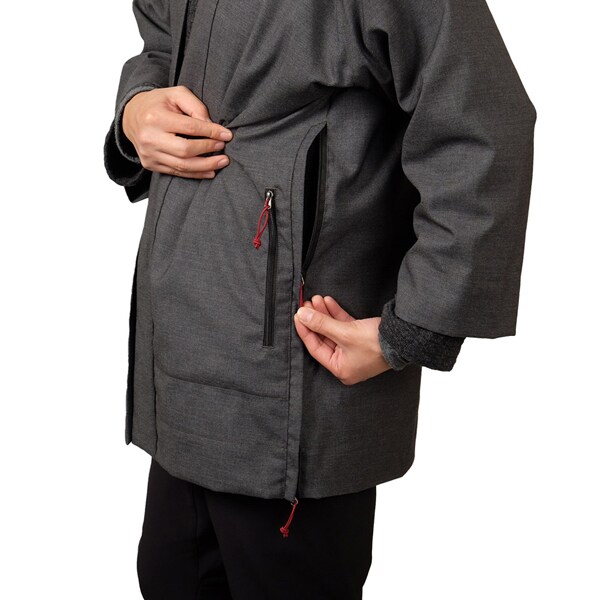 派手なストレッチはしませんが全体にゆったりした作りなのでシノギングにおけるストレスを感じることはありません。半纏には本来胸紐は付いていませんが、風が強い時のバタつきを抑えるために目立たないプラスチックのフックを付けています。また、急な登りで暑くなってきたらサイドジッパーを開けて外部の空気を入れ、オーバーヒートを軽減させることができます。