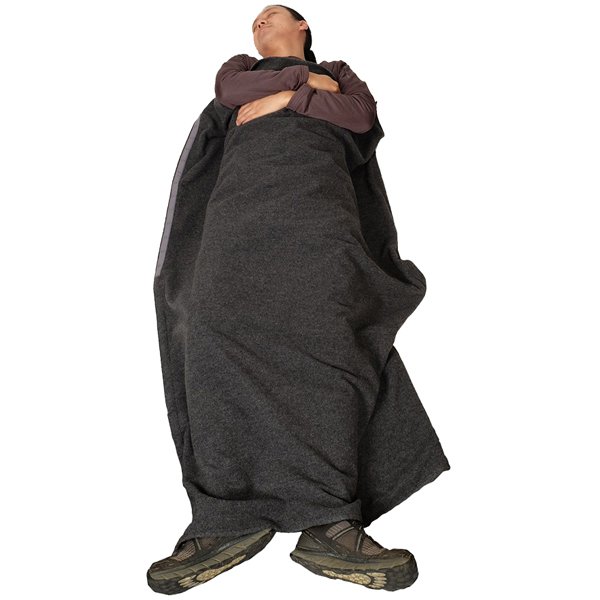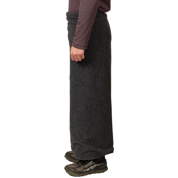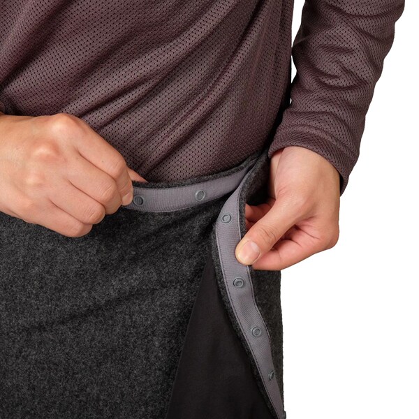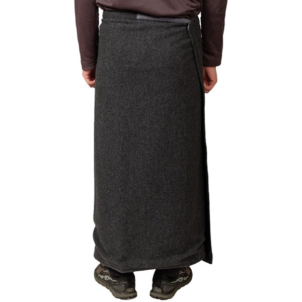 シノギングの休憩やハンモックタイムにさっと巻けるウールの巻きスカート。ウッドストーブを使うときに火の粉が飛んできたり、火にうっかり近付いたりしても溶けて穴が空くようなことはありません。ツユハラヒのように腰ひもを付けて無段階の調節にしてもよかったのですが、ショールとしての使い勝手を考えてテープ式の薄手のスナップボタンを選びました。ハンモックのごろ寝には小さいサイズのブランケットとしても使用できます。数年前まで販売していた初代ノヤマは縮絨したウールを使用していたので635gとヘビー級でしたが、アップデートしたノヤマは素材を起毛加工したウールに変えることで約40%も軽くなりました。これはアグラスカートよりもほんの少し重いくらいなので、シノギングに持ち出すのに躊躇はしませんね。