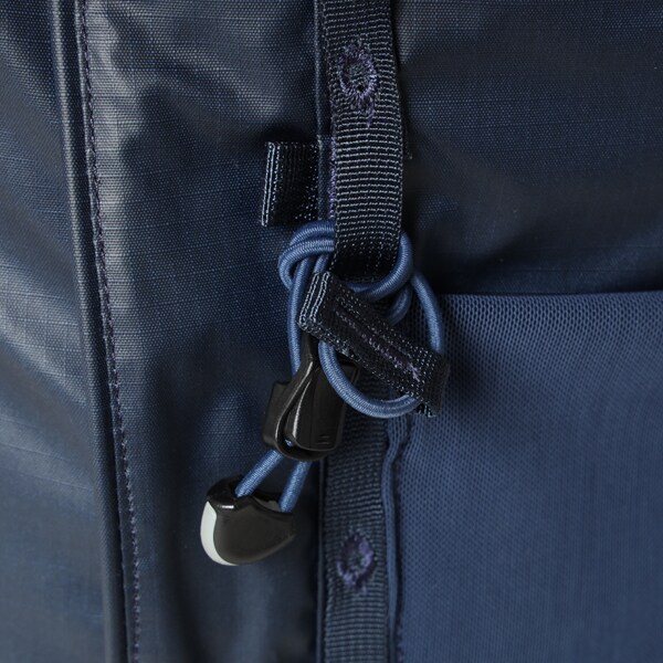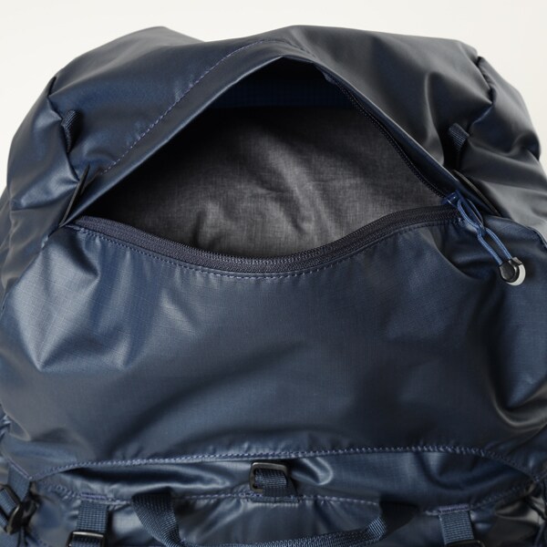 上部からも、フロントからも、横方向からも、いつでもすぐに取り出せます。上着や地図など行動途中で使用する大型のものを収納できるフロントポケットと、水筒などを収納できる2つのサイドポケットがあります。また、雨蓋式のため、荷物が容量より多くなった際でも、しっかりと固定することができます。